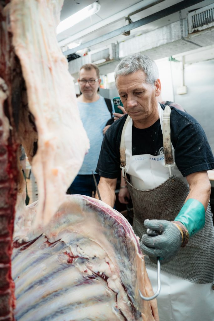 Der vierte Tag stand ganz im Zeichen von Handwerk und Genuss. Am Vormittag besuchten wir PIAF, wo wir eine Live-Zerlegung eines Rindes miterlebten. Mit geübten Handgriffen zeigten uns die Fleischexperten, wie aus einem ganzen Tier die bekannten Cuts entstehen – vom kräftigen Vacio bis hin zu edlen Steaks. Jeder Schnitt saß, und man spürte die enorme Erfahrung, die hier am Werk war. Für mich war es faszinierend, all das, was wir bisher gegessen hatten, nun in seiner Entstehung zu sehen.